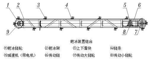 由鋼架、傳動(dòng)鏈條、傳動(dòng)鏈輪、減速機(jī)和滑塊等部件組成,驅(qū)動(dòng)裝置的電機(jī)功率為4KW。片冰機(jī)運(yùn)行期間,耙冰機(jī)反向旋轉(zhuǎn),將落下片冰儲(chǔ)冰室內(nèi)水平攤鋪;在儲(chǔ)冰庫(kù)出冰循環(huán)過(guò)程中,耙冰機(jī)反向旋轉(zhuǎn),將片冰耙進(jìn)檔冰板下方的水平輸送螺旋機(jī)。耙冰機(jī)的高度由升降裝置調(diào)整并固定。