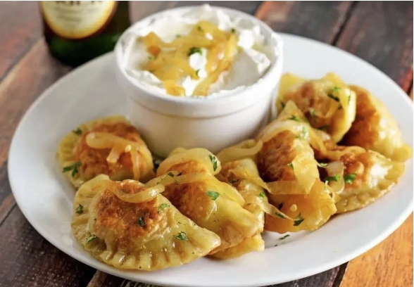 波蘭餃子,波蘭人最喜愛的美食之一,也是經(jīng)典的節(jié)日食物。Pierogi 面皮一般會加入黃油、雞蛋和酸奶油制作,內(nèi)餡填上土豆泥芝士和洋蔥,入油鍋煎到脆香,蘸醬通常是酸奶油。在圣誕節(jié)時,波蘭人還會吃酸菜餡餃子。