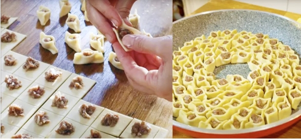 曼提雜糅了蒙古的羊肉餡料、中東的調(diào)味以及東亞的吃法。它的面皮類似餛飩皮,餡主要以牛羊肉末加上碎洋蔥,再加上香料調(diào)味而成。將餡搓成小肉丸放在正方形面皮上,之后以雙手的拇指與食指向中間捏緊成型即可。
